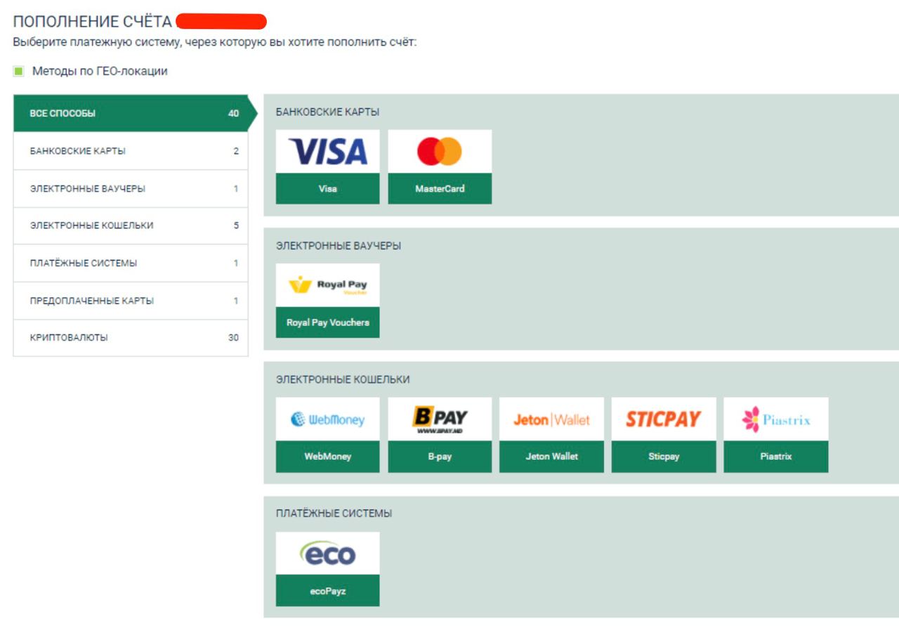 Платёжные системы: ecoPayz, Payeer, AdvCash. Минимальные суммы варьируются от 1 до 10 долларов в зависимости от конкретной системы.